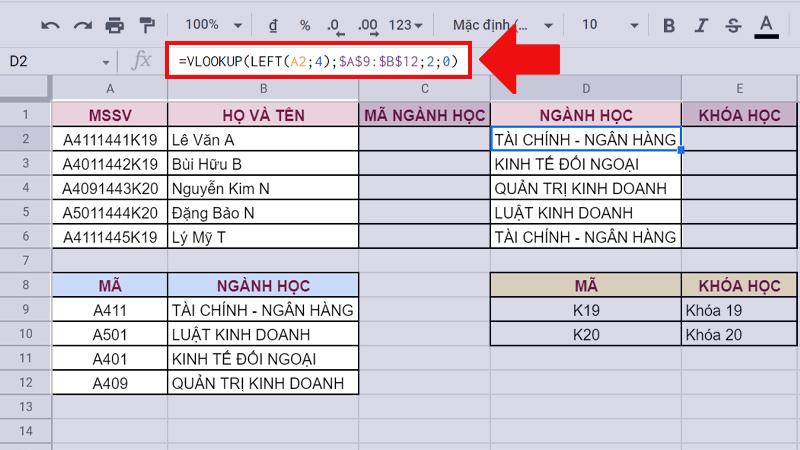 Bước 3: Tại ô D2 > Bạn tiến hành nhập công thức “=VLOOKUP(LEFT(A2;4);$A$9:$B$12;2;0)” > Sau đó bạn nhấn enter > Cuối cùng, kết quả cho ra ngành học theo đối chiếu nằm ở bảng ngành học.