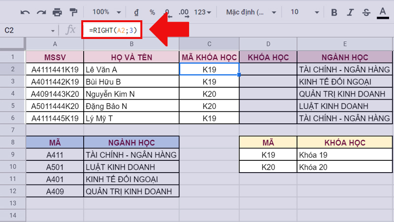 Sử dụng hàm RIGHT để lấy ra mã khóa học trong MSSV như hình trên
