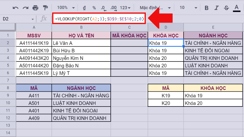 Bước 3: Tại ô D2 > Bạn nhập vào công thức “=VLOOKUP(RIGHT(A2;3);$D$9:$E$10;2;0)” > Tiếp theo, bạn nhấn enter > Hàm sẽ cho ra kết quả khóa học theo đối chiếu ở bảng khóa học.