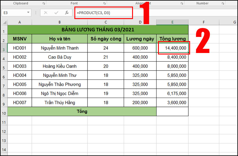Thông thường, các bạn sẽ tính tích của các số ở cột C với cột D để tính lương của từng người: