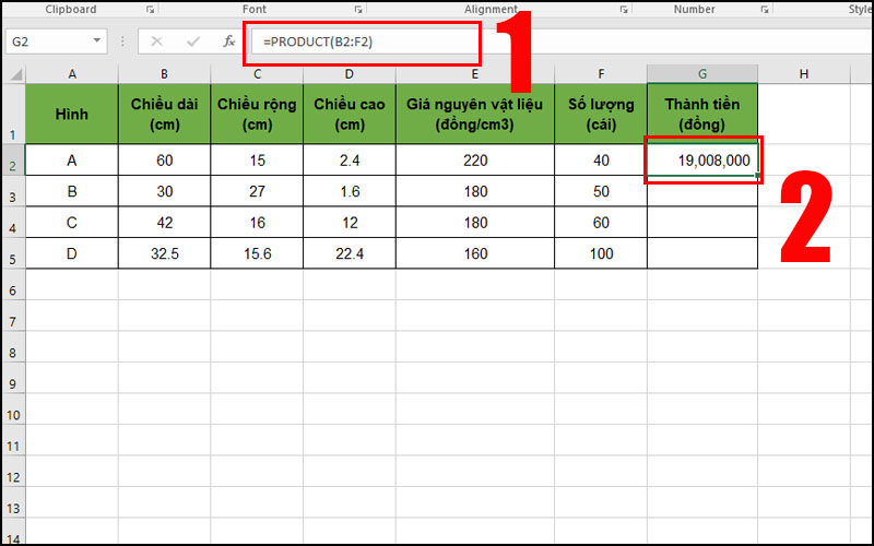 Nhập hàm =PRODUCT(B2, C2, D2) > Nhấn chọn Enter. Kết quả phép nhân sẽ được hiển thị lên màn hình.
