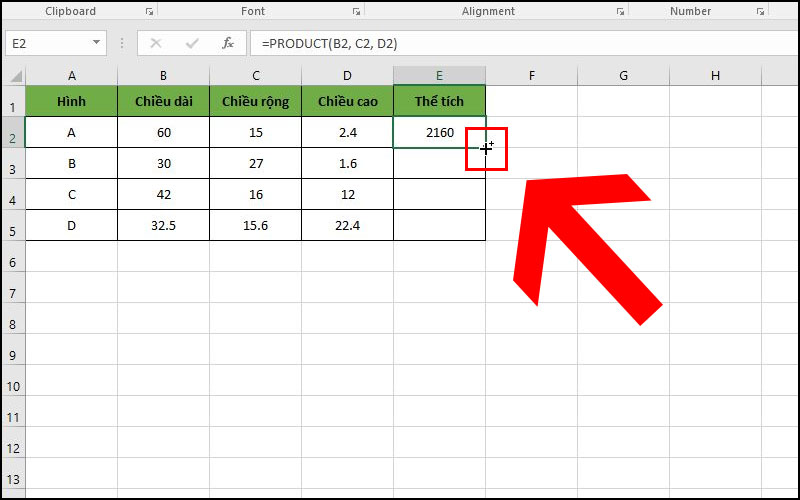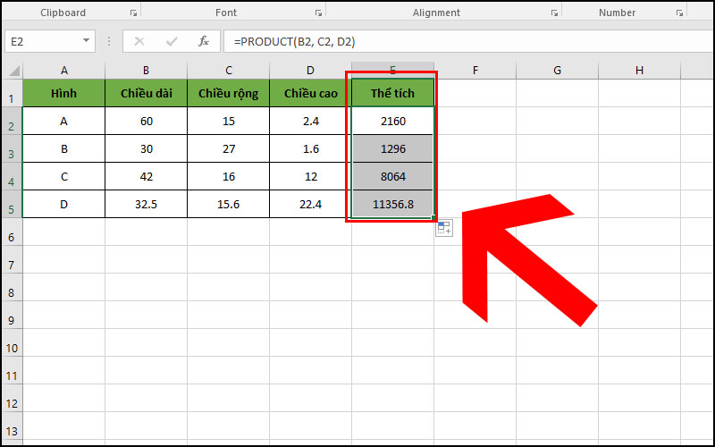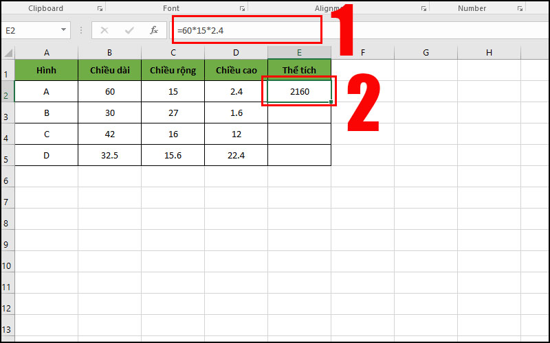 Bạn hãy thực hiện phép tính thể tích của hình hộp với các kích thước lần lượt là các số sau60, 15, 2.4. Các bạn nhập =60*15*2.4 > Nhấn Enter. Kết quả trả về sẽ là 2160.