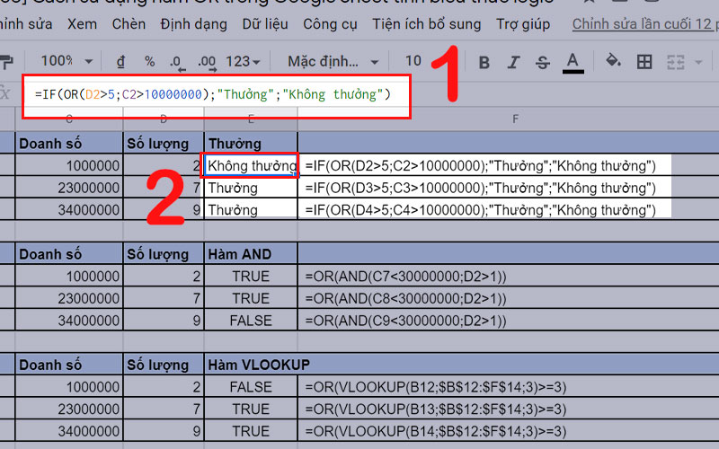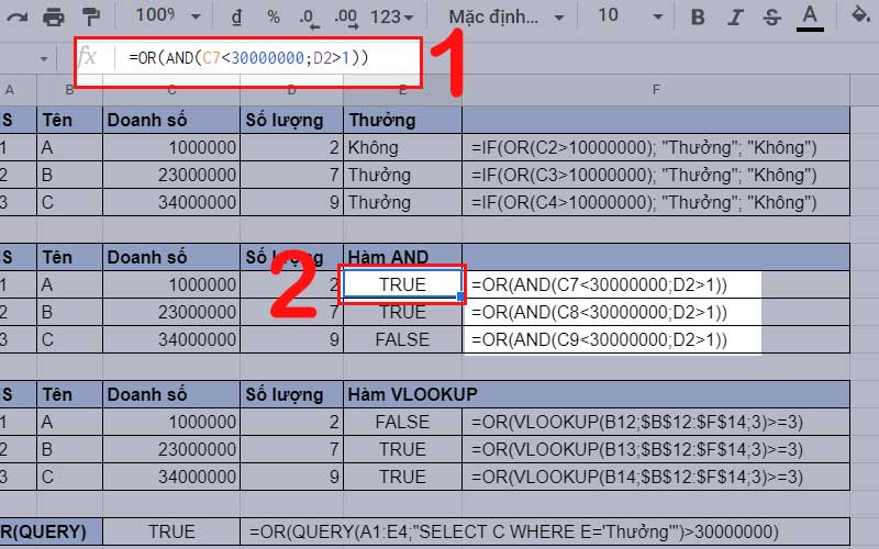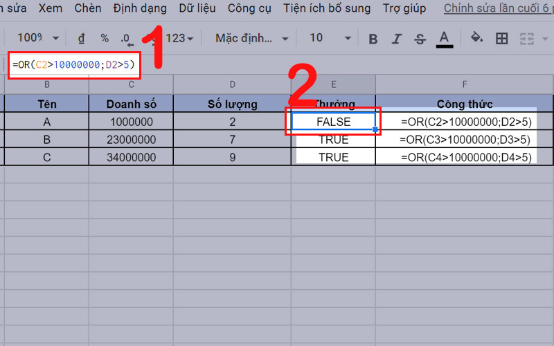 Ý nghĩa công thức: Hàm OR sẽ kiểm tra xem C2 có giá trị lớn hơn 10000000 hoặc ô D5 có lớn hơn 5, nếu có thì trả về TRUE, và nếu không thỏa điều kiện thì trả về FALSE.