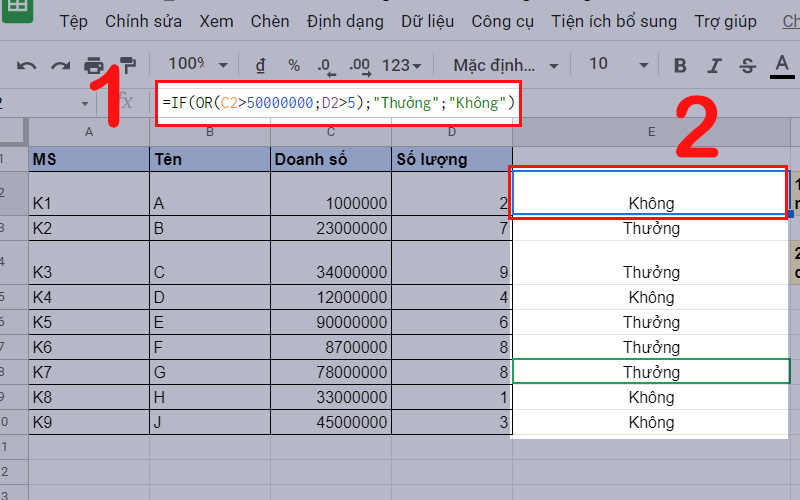 =IF(OR(C2>50000000;D2>5);"Thưởng";"Không")