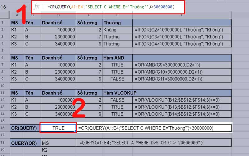 Câu 1: Hãy sử dụng hàm QUERY và hàm OR để tìm xem những nhân viên nào có doanh số trên 30.000.000 hoặc số lượng bán trên 5.