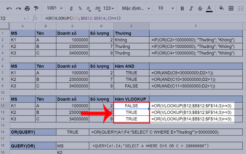 Ý nghĩa công thức: Hàm VLOOKUP là dò tìm các giá trị giống ô B12 trong bảng $B$12:$D$14, nếu có thì sẽ trả về ô tương ứng trong cột 3, kết quả trả về là ô trong cột số lượng, nếu các giá trị số lượng trả về lớn hơn hoặc bằng 3 thì hàm OR sẽ đưa ra kết quả là TRUE, và sai là FALSE.