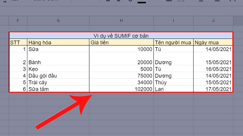 Dữ liệu dùng để minh họa những công thức trong bảng trên nằm tại ô Sheet 6, bảng "Ví dụ về SUMIF cơ bản" phạm vi từ A5 đến A12, gồm các cột như là: STT, Hàng hóa, Giá tiền, Tên người mua, Ngày mua.