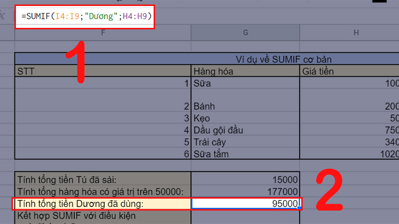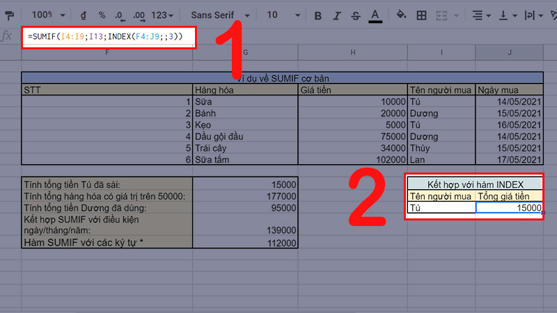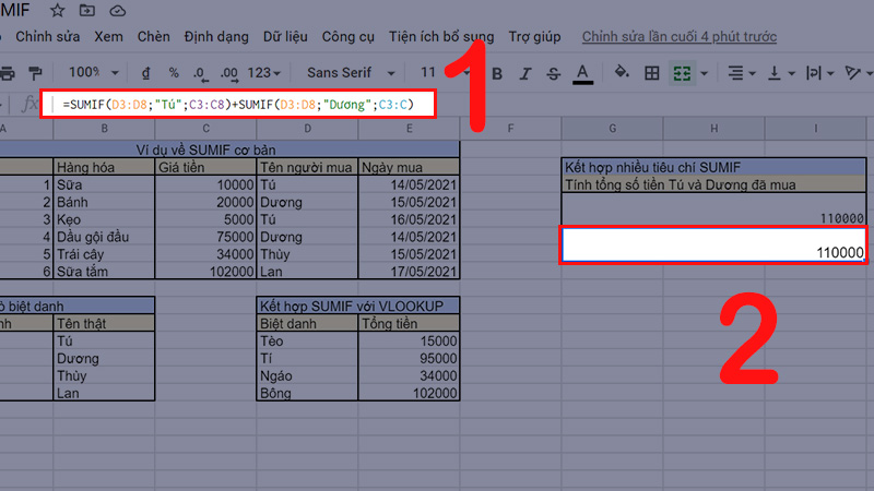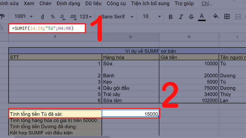 Ý nghĩa: Tính tổng số tiền mà bạn Tú và bạn Dương đã dùng bằng sử dụng 2 lần SUMIF cho 2 điều kiện khác nhau.