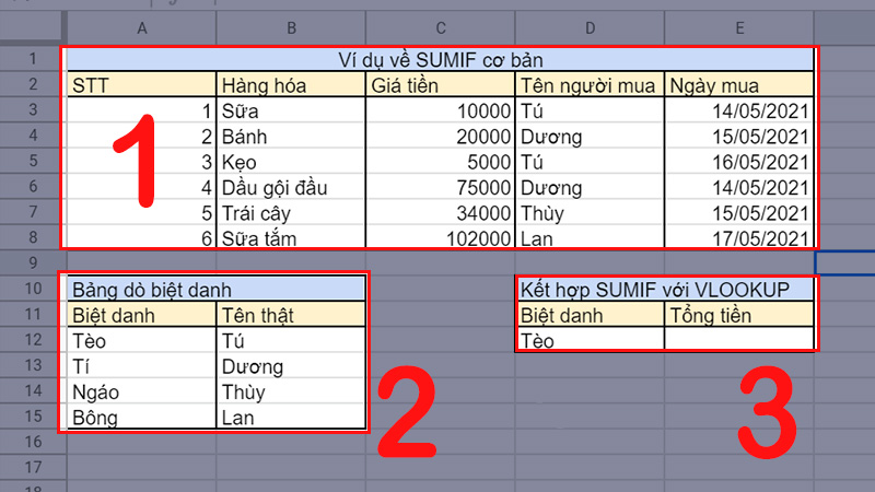 Quay lại với hàm SUMIF, tại Sheet 2, đề bài là sự kết hợp 2 hàm này thông qua bài toán tính tổng tiền mà Tú đã xài dựa trên biệt danh Tèo, sử dụng 3 bảng sau: "Ví dụ về SUMIF cơ bản" từ phạm vi A1 đến E8, "Bảng dò biệt danh" phạm vi từ A10 đến B12 và "Kết hợp SUMIF với VLOOKUP" từ D10 đến E12 nhé.