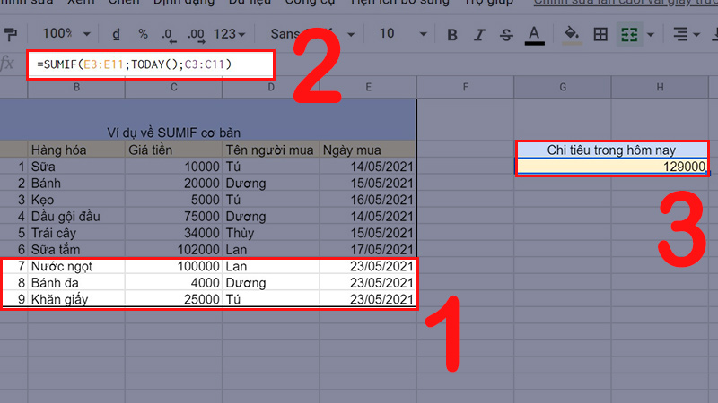 Giải thích: Sau khi các bạn nhập công thức thì có kết quả là 129000 (100000 + 4000 + 25000), hàm SUMIF dò điều kiện TODAY() tức là ngày (23/05/2021) có khớp với ô nào trong phạm vi E3:E11 không, sau đó các bạn cộng dồn tất cả các giá trị của các ô tương ứng trong phạm vi C3:C11 để thỏa điều kiện có ngày mua là ngày 23/05/2021.