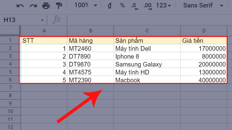 Để minh họa cho phần này, tại Sheet 4, mình đã chuẩn bị sẵn một bảng dữ liệu như hình dưới đây sẽ có phạm vi từ A1 đến D6, gồm các trường như là: STT, Mã hàng, Sản phẩm và Giá tiền.