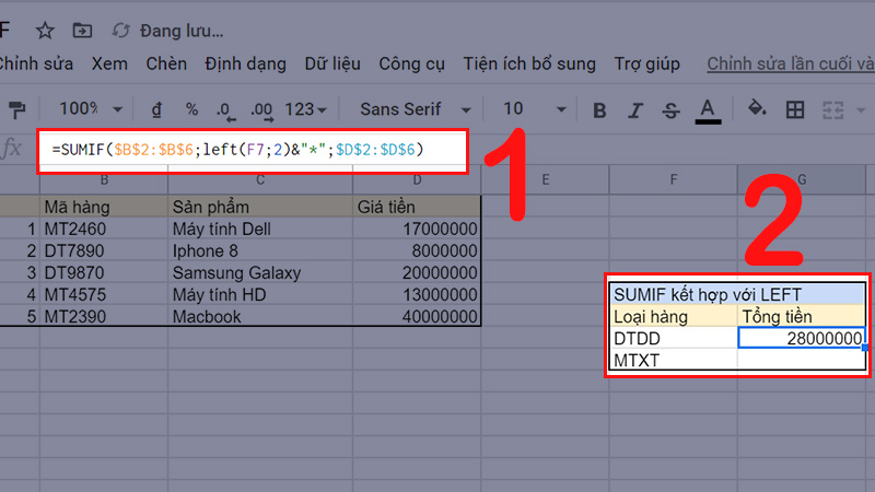 Giải thích: Hàm lấy điều kiện left(F7;2)&"*", tức là “DT*” dò trong dãy phạm vi B2:B6. Sau đó, với những ô thỏa điều kiện, các bạn cộng các giá trị ô ứng bên dãy D2:D6. Cuối cùng, kết quả sẽ thu được là 28000000 (8000000 + 20000000)