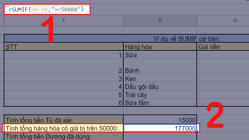 Ví dụ về hàm SUMIF cơ bản như hình trên