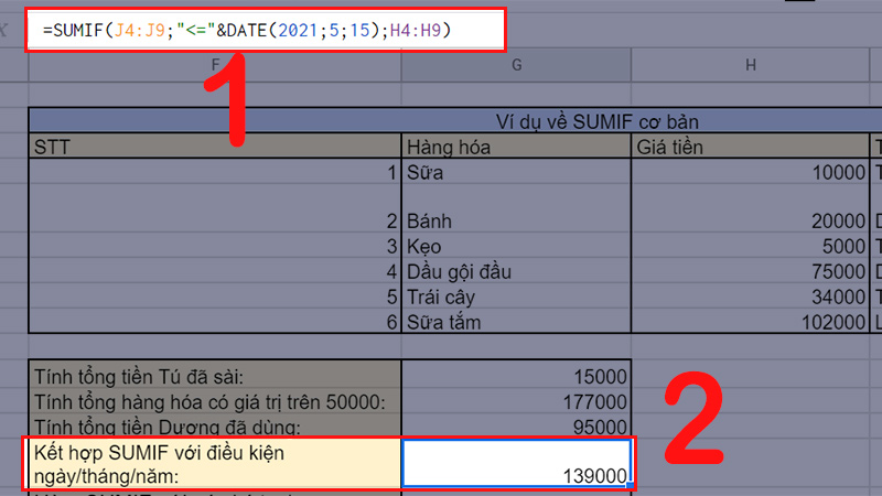 Giải thích: Hàm sẽ xét trong phạm vi J4:J9 nếu có giá trị là ngày/tháng/năm nhỏ hơn hoặc bằng ngày 15/05/2021 thì các bạn sẽ cộng dồn các giá trị của các ô tương ứng bên cột H4:H9. Đáp án sẽ được tìm ra là 139000 (10000 + 20000 + 75000 + 34000).