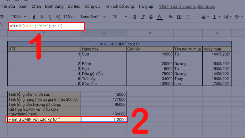 Giải thích: Hàm sẽ xét phạm vi của ô G4:G9 chứa từ “Sữa” ở đầu thì sẽ cộng dồn các giá trị tại các ô tương ứng bên phạm vị H4:H9, kết quả tính cho ra là 112000 (10000 + 102000).