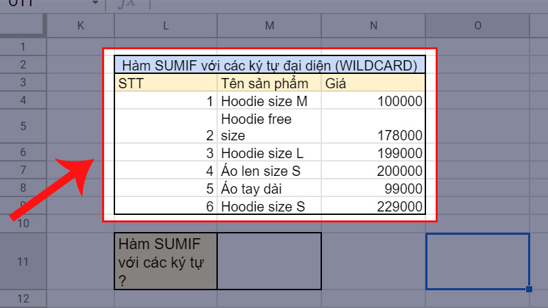 Ví dụ tại Sheet 1, mình sẽ tạo thêm một bảng dữ liệu tên là "Hàm SUMIF với các ký tự đại diện (WILDCARD)" từ tô L2 đến N9, nội dung về những sản phẩm liên quan đến quần áo. Bảng sẽ gồm 3 cột là: STT, Tên sản phẩm và Giá.