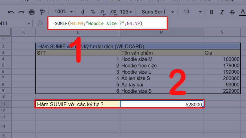 Giải thích: Trong đó, hàm dò điều kiện sẽ là “Hoodie size ?” trong phạm vi M4:M9, nếu phù hợp với điều kiện chỉ có 1 ký tự đằng sau “Hoodie size ” thì cộng giá trị tại các ô tương ứng trong dãy M4:M9 trong bảng, kết quả tính được sẽ là 528000 (100000 + 199000 + 229000).