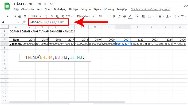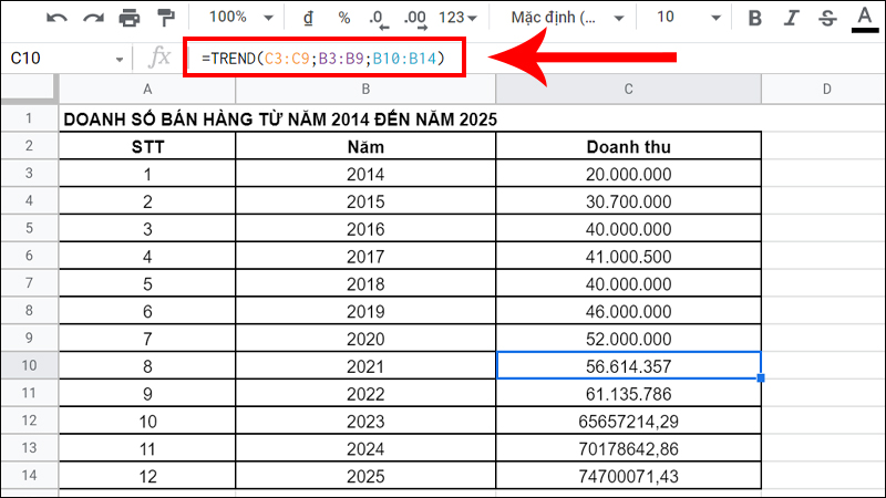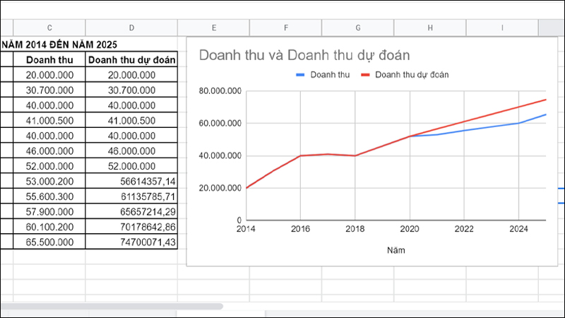 Ý nghĩa công thức: Dựa vào dữ liệu doanh thu từ năm 2014 đến năm 2020, bạn có thể đưa ra dự đoán doanh thu cho những năm tiếp theo (từ 2021 đến năm 2025).