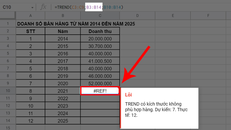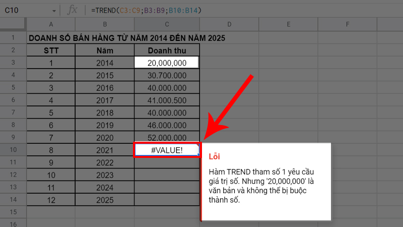 Một số lỗi thường gặp khi bạn sử dụng hàm TREND trong Google Sheet