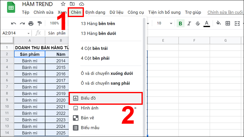 Bước 1: Đầu tiên, bạn chọn bảng dữ liệu > Nhấn chọn Chèn > Nhấn chọn Biểu đồ.