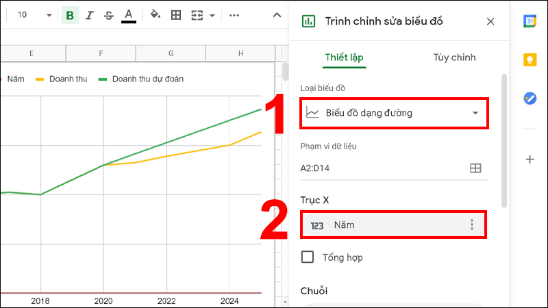 Bước 2: Ở tab Thiết lập tại mục Loại biểu đồ nhấn chọn Biểu đồ dạng đường > Tại Trục X bạn chọn Năm.