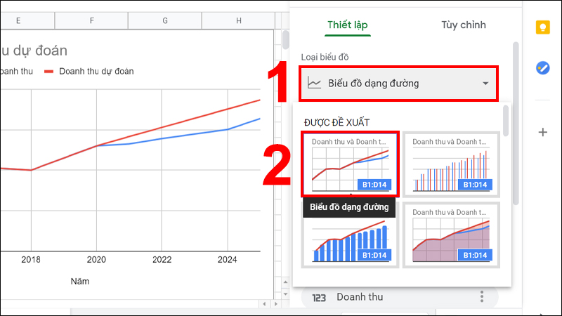 Bước 4:Tiếp tục vào lại mục Loại biểu đồ > Nhấn chọn Biểu đồ dạng đường được đề xuất.