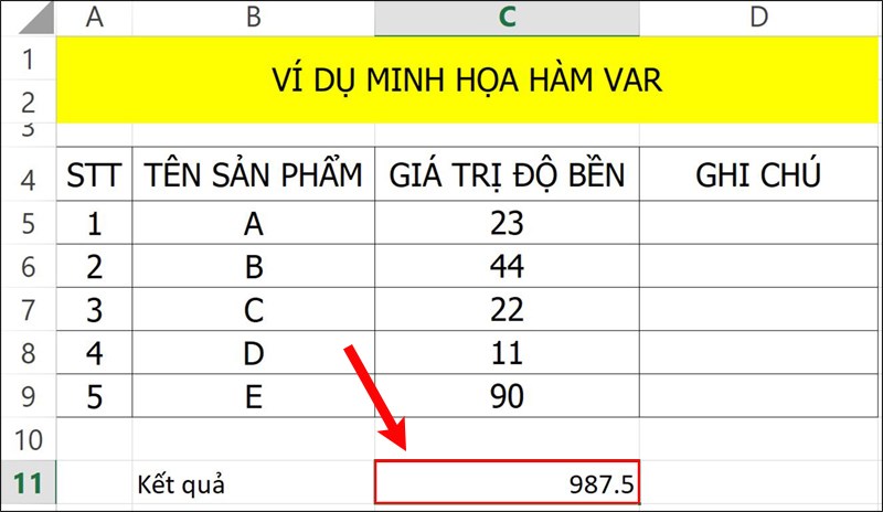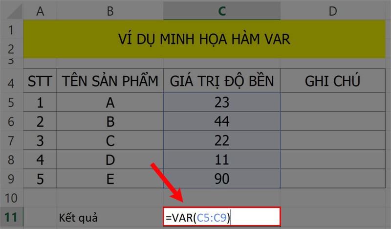 Ví dụ: Các bạn ãy sử dụng hàm VAR để tìm kết quả phương sai độ bền của các số trong bảng sau.