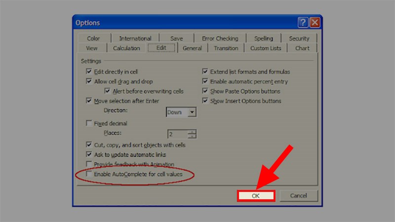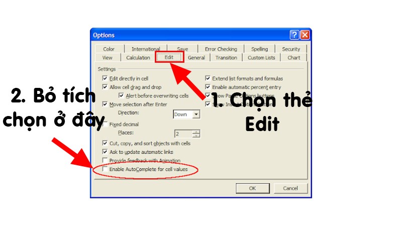 Bước 2: Hộp thoại sẽ hiện lên > Chọn Edit > Bỏ tích Enable Autocomplete for cell values.