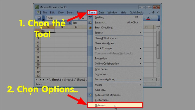 Bước 1: Mở file Excel > Chọn vào thẻ Tools > Chọn Options.