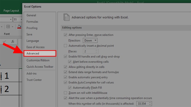 Đi đến phần Editing Options > Bỏ tích Enable Autocomplete for cell values > Nhấn chọn OK để sửa lỗi gõ tiếng Việt đ thành dđ trong Excel.