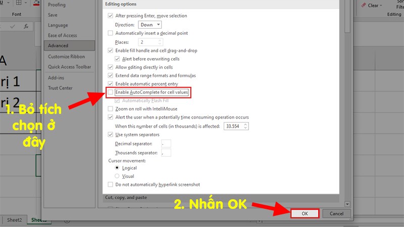 Bước 4: Đi đến phần Editing Options > Bỏ tích Enable Autocomplete for cell values > Nhấn chọn OK để sửa lỗi gõ tiếng Việt đ thành dđ trong Excel.
