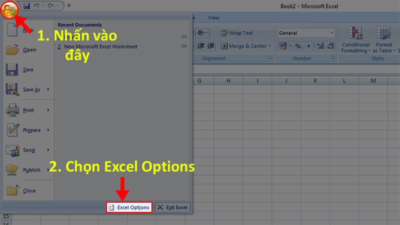 Mở file Excel > Nhấn chọn vào Microsoft Button > Excel Options.