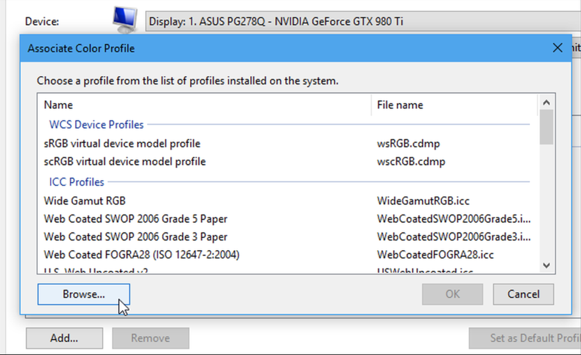 Bạn sẽ thấy một danh sách các cấu hình màu được cài đặt trên hệ thống của bạn. Để cài đặt tệp ICC hoặc ICM mới, hãy nhấp vào nút Duyệt Duyệt của Bỉ, duyệt đến tệp ICC hoặc ICM bạn muốn cài đặt và nhấp đúp vào tệp.