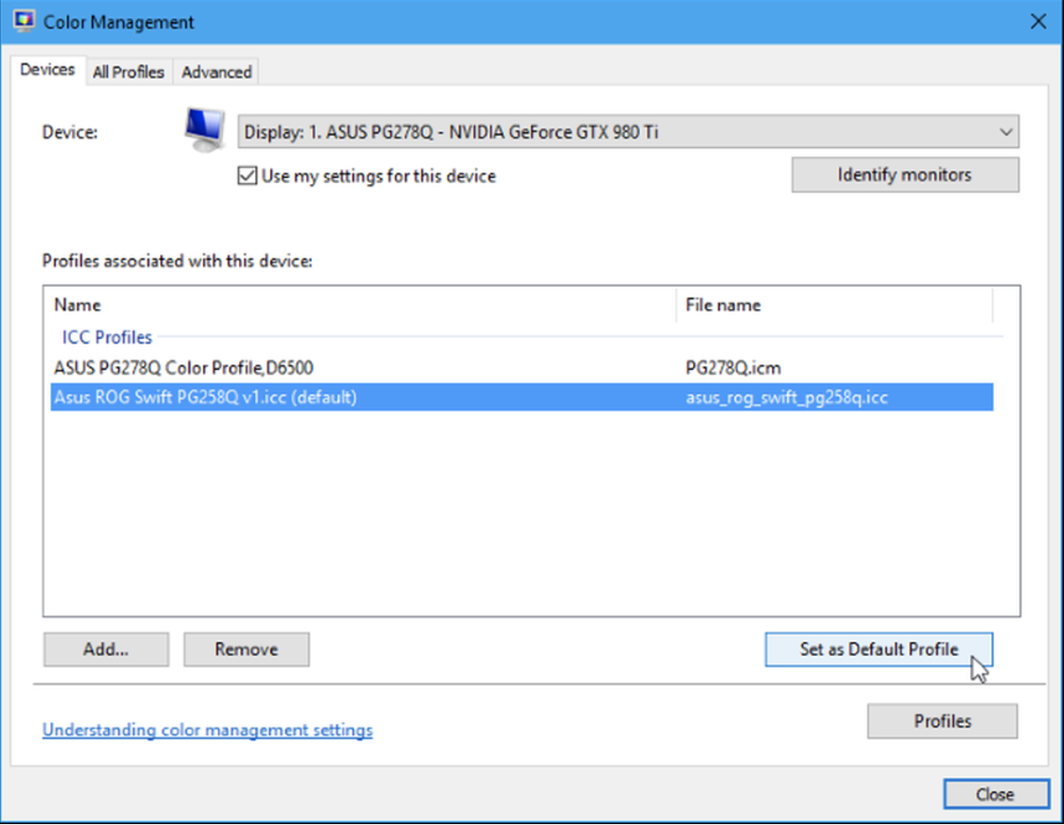 Bạn sẽ thấy cấu hình màu bạn đã cài đặt xuất hiện trong danh sách các cấu hình được liên kết với thiết bị. Nếu bạn đã cài đặt nhiều cấu hình, hãy chọn một cấu hình bạn muốn sử dụng trong danh sách và nhấp vào Cài đặt cài đặt làm Hồ sơ mặc định, để đặt nó làm mặc định.