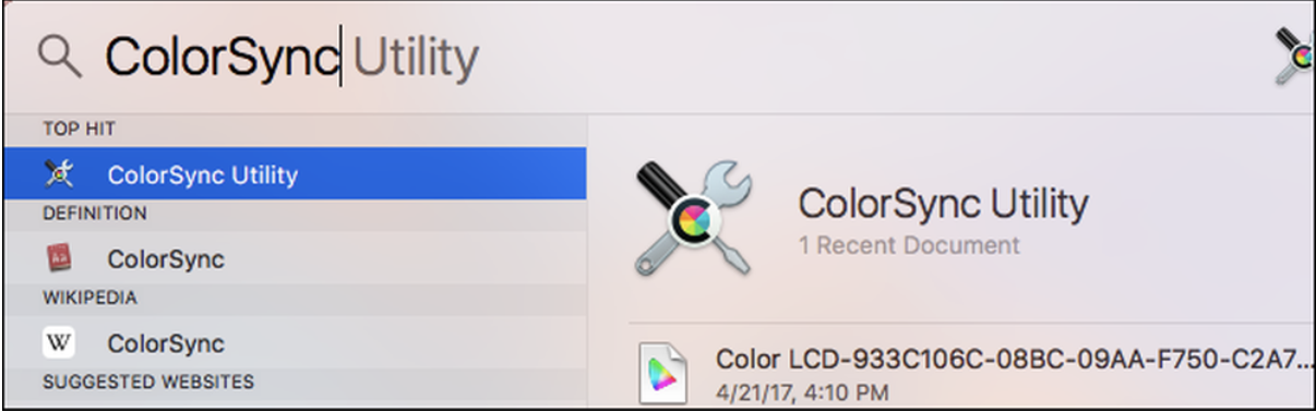 Bạn có thể cài đặt cấu hình màu bằng Tiện ích ColorSync trên máy Mac. Để khởi chạy nó, nhấn Command + Space để mở tìm kiếm Spotlight, nhập vào Color ColorSync, và nhấn Enter. Bạn cũng sẽ tìm thấy nó tại Finder> Ứng dụng> Tiện ích> Tiện ích ColorSync.
