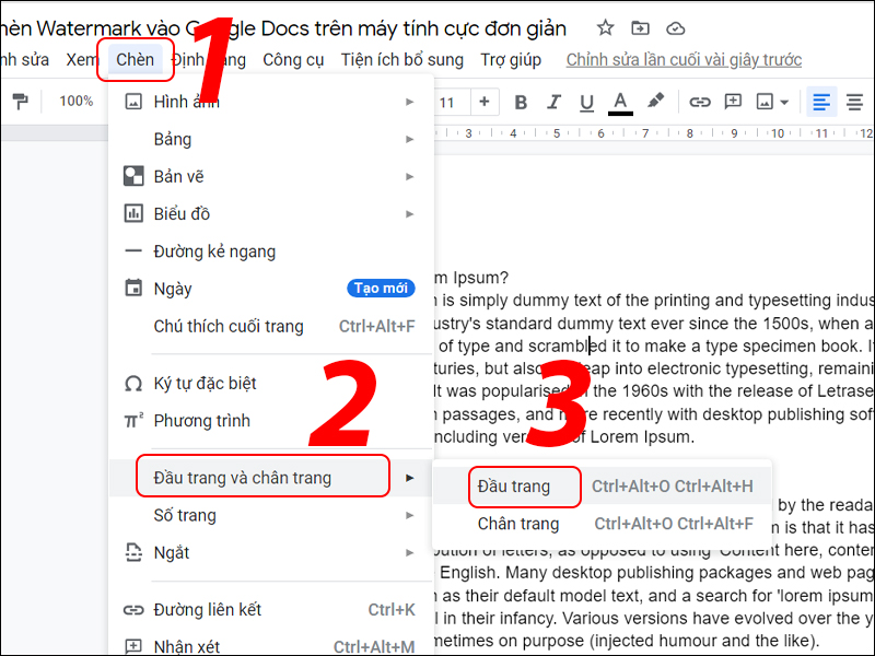 Bước 2: Trong tệp docs, nhấp vào Chèn > Chọn Đầu trang và chân trang > Chọn Đầu trang.