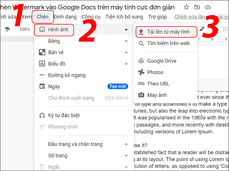 Tại vị trí muốn chèn ảnh watermark, nhấp vào Chèn > Chọn Hình ảnh > Chọn Tải lên từ máy tính.