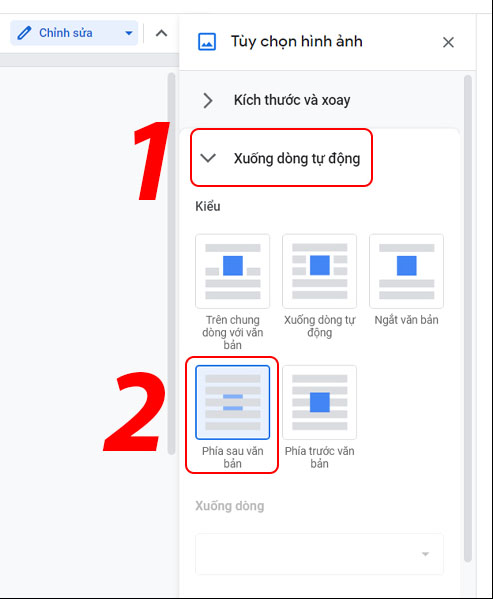 Chọn Xuống dòng tự động > Chọn kiểu Phía sau văn bản.