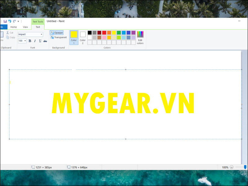 Bước 1: Thiết kế mẫu watermark trên phần mềm Paint (nếu sử dụng hệ điều hành Windows). Ví dụ, bạn có thể tạo một mẫu "mygear.vn" với font chữ Impact, kích thước 100.