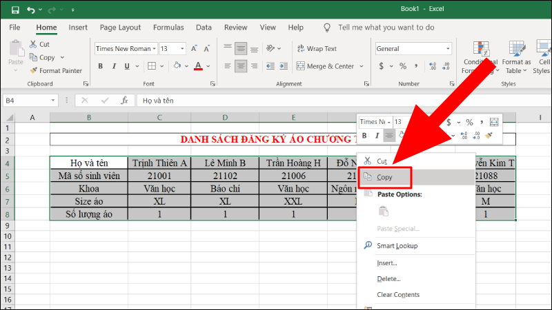 Bước 2: Nhấn chuột phải vào dữ liệu đã chọn và chọn sao chép (hoặc sử dụng phím tắt Ctrl + C).