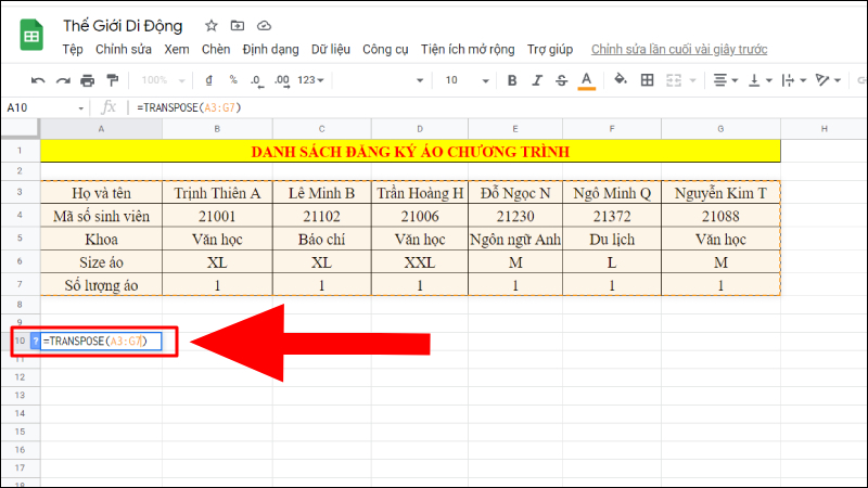 Bước 2: Nhấn chọn ô bất kỳ phía dưới cùng của bảng > Nhập công thức "=TRANSPOSE(A3:G7)" > Nhấn Enter để hoàn tất.