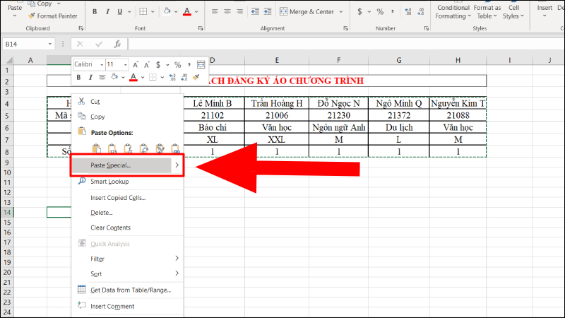 Tiến hành nhấn chuột phải và chọn Paste Special