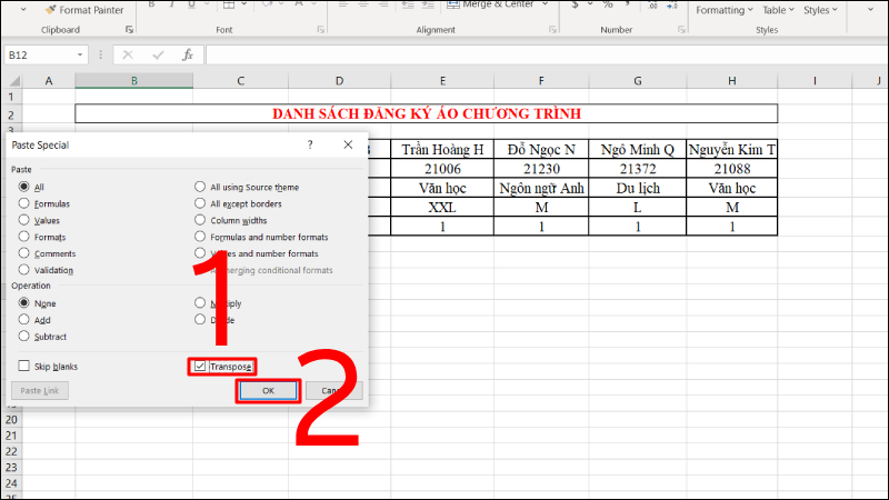 Bước 4: Tích chọn ô Transpose (Chuyển vị) trong hộp thoại Paste Special và nhấn OK.