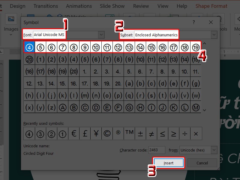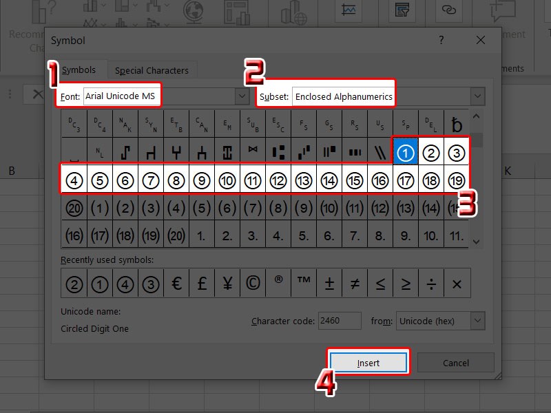 Bước 3: Tại phần Font, chọn Arial Unicode MS, tại phần Subset, chọn Enclosed Alphanumerics, và nhấp vào Chèn.