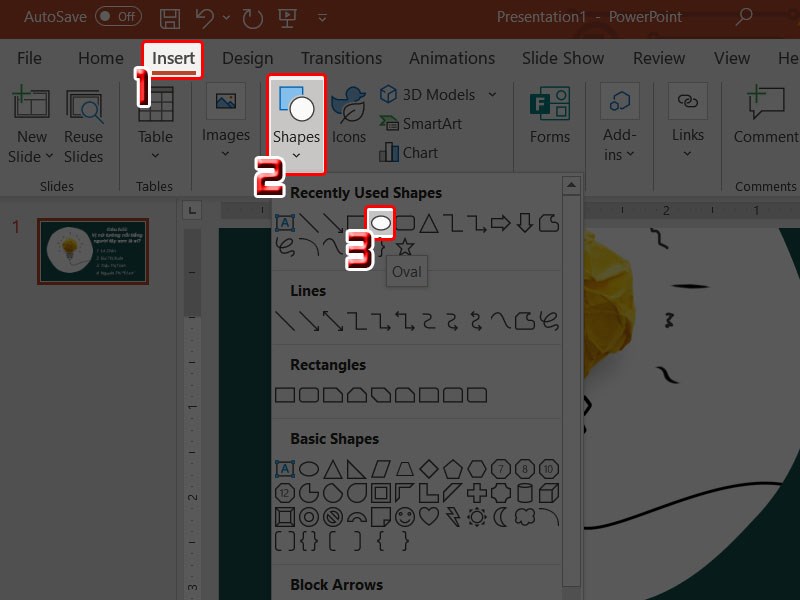 Bước 2: Chọn Hình dạng, sau đó chọn hình Oval trong menu.