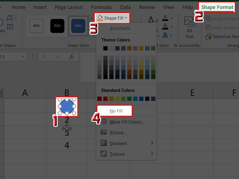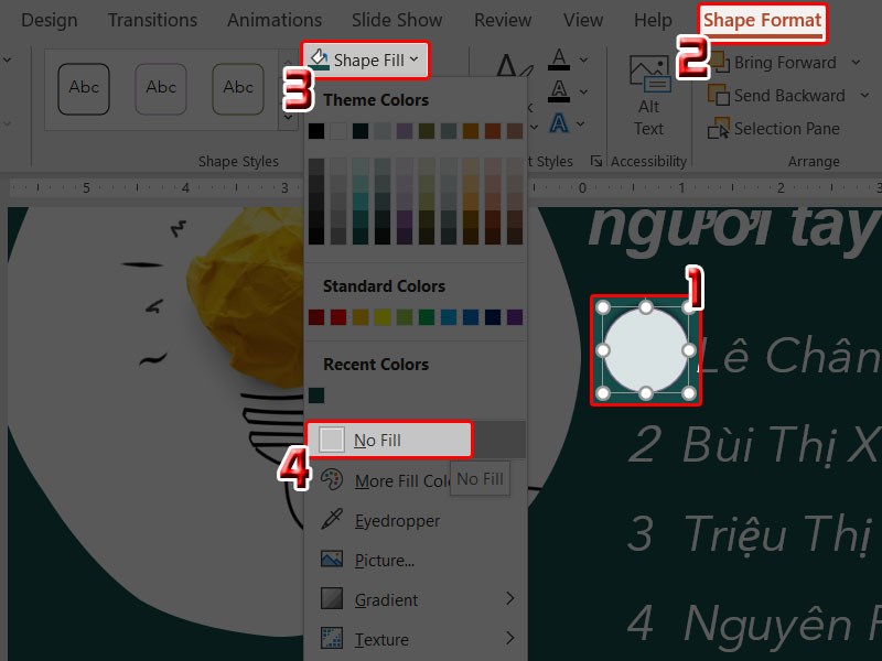 Bước 3: Để loại bỏ màu nền của hình dạng, hãy nhấp vào hình vừa tạo và vào Định dạng hình dạng, chọn Màu nền hình dạng và chọn Không màu để tắt màu nền.