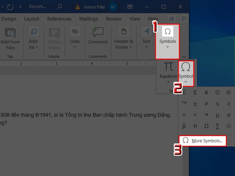 Bắt đầu bằng việc nhấn Insert, sau đó chọn Symbols, tiếp theo là Symbol, và nhấp vào More Symbols. Trong hộp thoại hiện ra, chọn Font là Arial Unicode MS và Subset là Enclosed Alphanumerics. Cuối cùng, nhấp vào Insert.