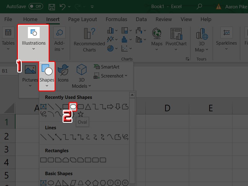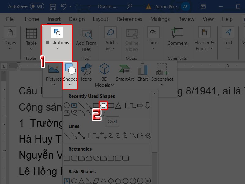 Bước 2: Tiếp theo, chọn Hình vẽ, sau đó chọn Hình dạng và chọn hình Oval.