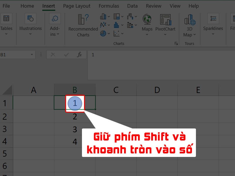 Bước 1: Đặt con trỏ chuột vào vị trí bạn muốn tạo hình tròn đáp án. Trên thanh công cụ, nhấp vào tab Chèn.