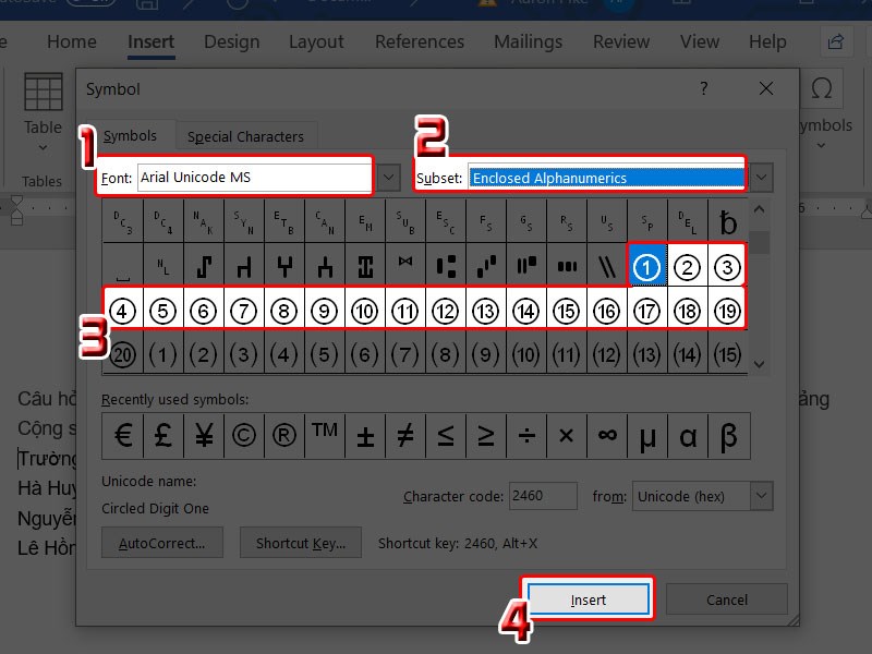 Bước 3: Trong hộp thoại hiển thị, chọn Font là Arial Unicode MS và Subset là Enclosed Alphanumerics. Tiếp theo, chọn kiểu khoanh tròn số mà bạn muốn sử dụng và nhấn Insert để áp dụng.